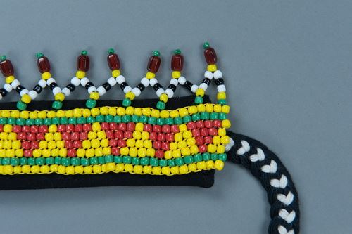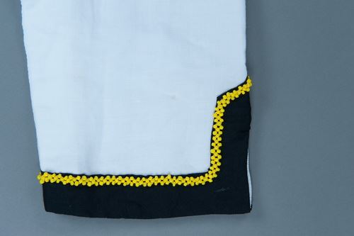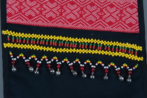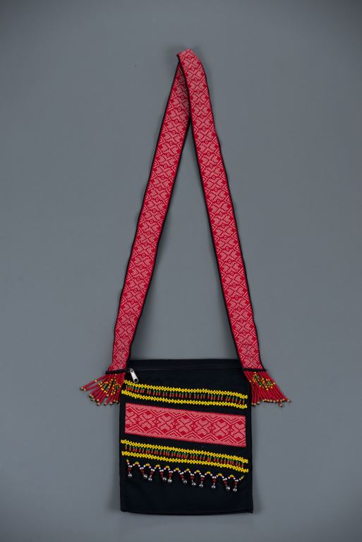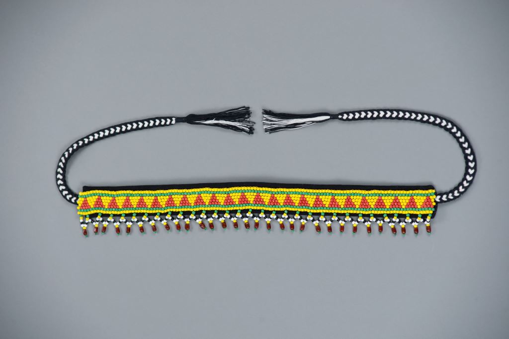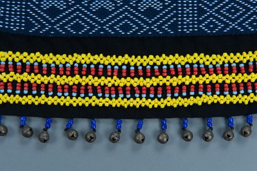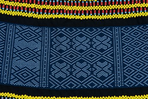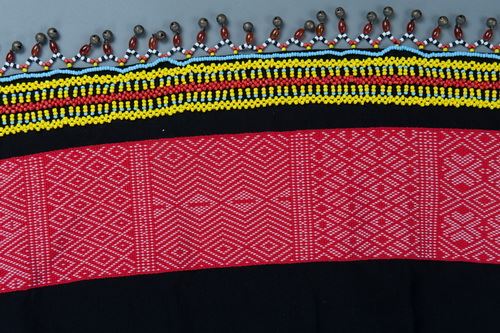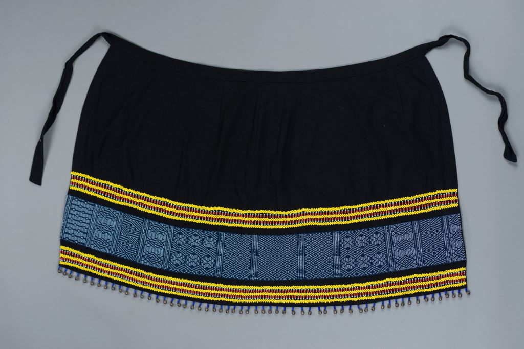 該件新娘腰裙由兩幅麻布所縫成,色系由黑、藍、紅三色構成,間飾以金黃、淺藍、紅色玻璃珠及瑪瑙珠等,上半為淺藍棉布,下半縫接織花布塊,織紋結構主要以垂直與水平相關為基本原則,等距間隔的呈現菱形、曲線、交叉、米字等組合紋樣,裙布下擺縫飾整排玻璃珠串連的小銅鈴。