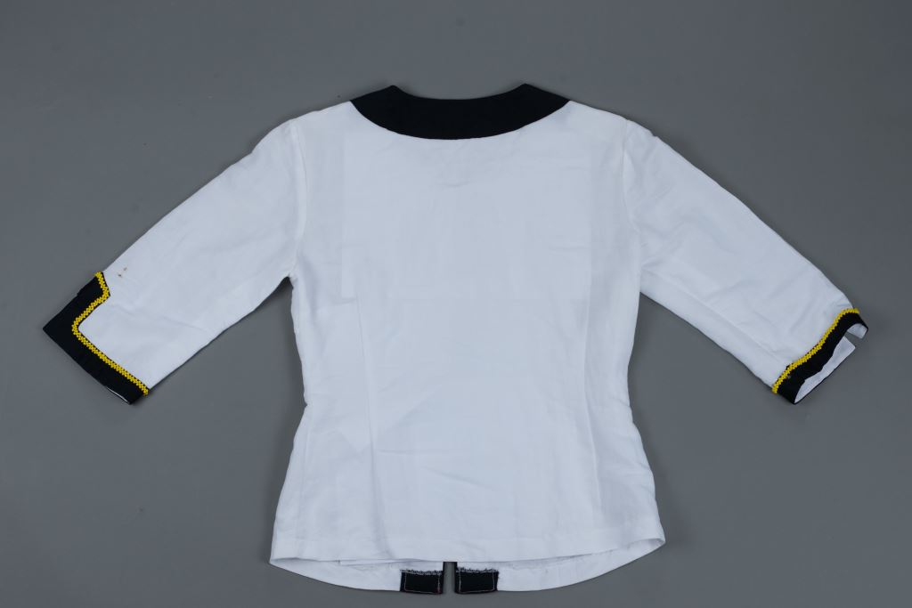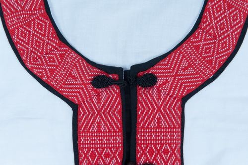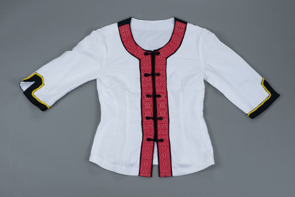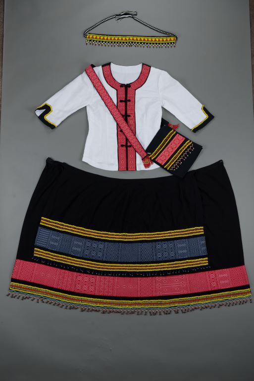 此組服飾有:頭飾、上衣、攜物袋(檳榔袋)、方布腰裙、長裙等物件,是傳統噶瑪蘭新娘禮服的重製作品,噶瑪蘭古語稱為mak lazungan。