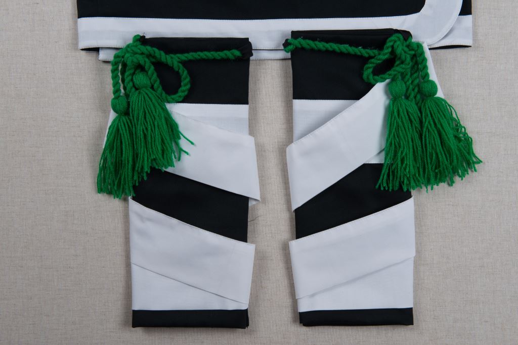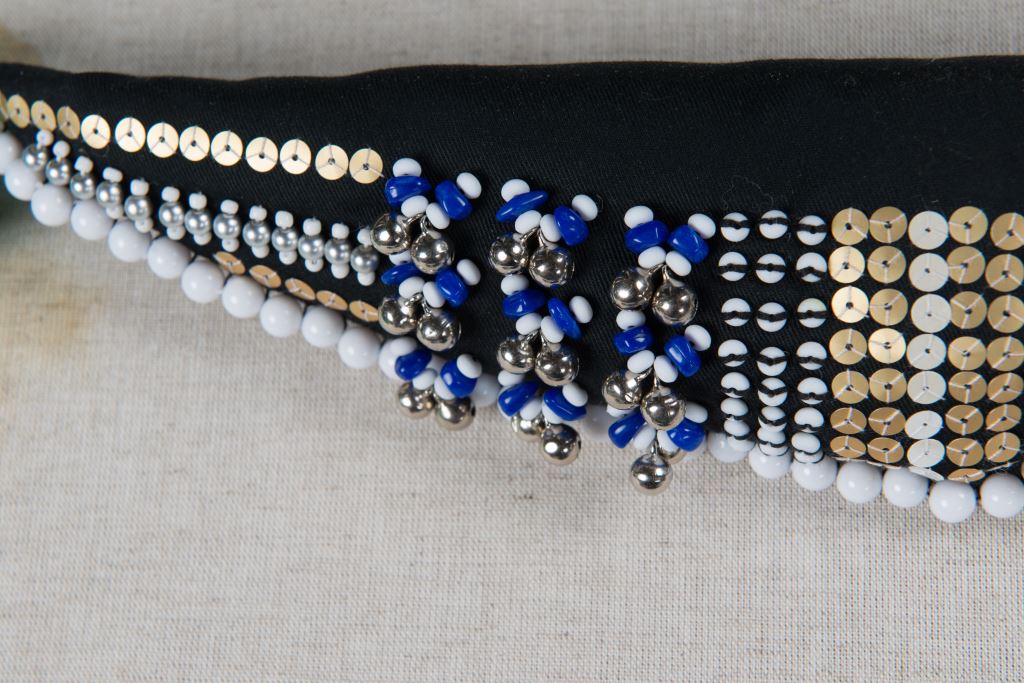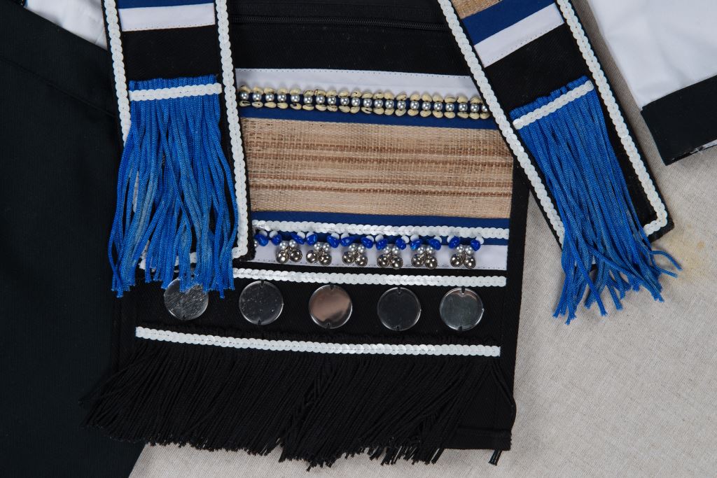 該件服飾的攜物袋(檳榔袋)的表布是用香蕉絲編織而成,噶瑪蘭人早期以香蕉絲編織衣物及生活用品,今則以香蕉絲創意衣帽、飾品等手工藝品著稱。