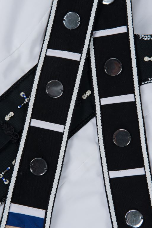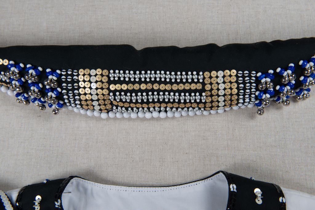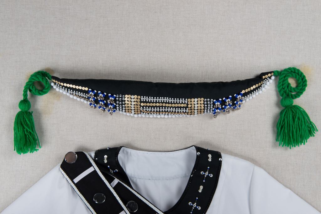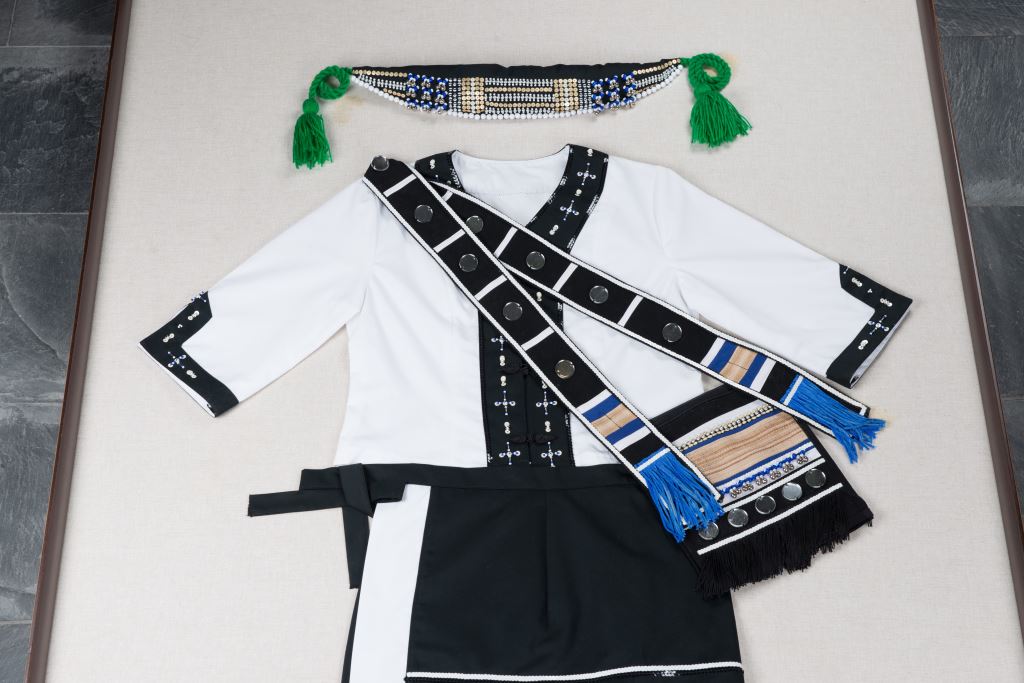 該組服飾有:頭飾、上衣、攜物袋(檳榔袋)、長裙、護腿布等物件,為新社部落的噶瑪蘭人於近代民族復名運動時,所重製的噶瑪蘭族服飾。