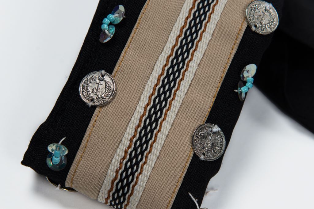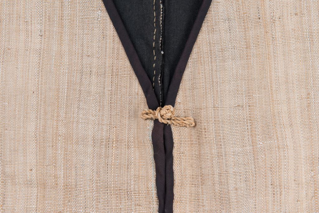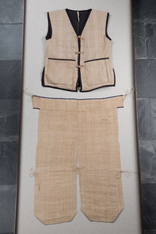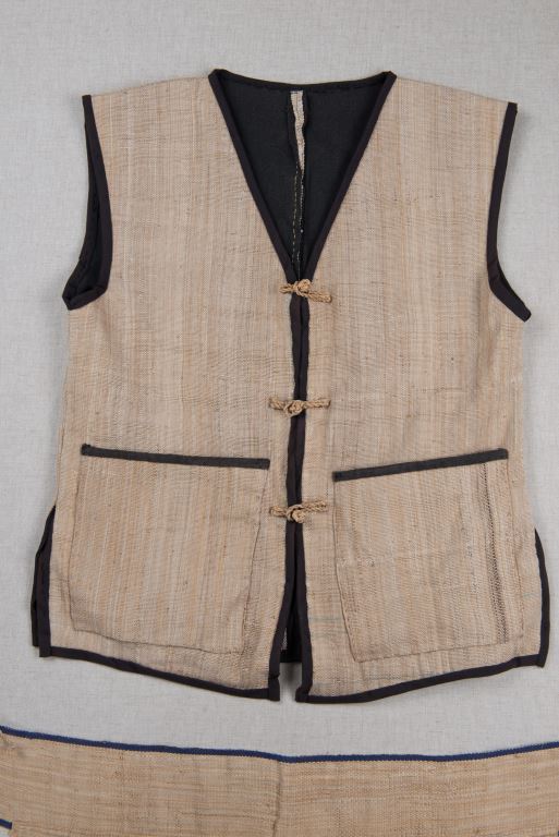 該組服飾有:無袖滾黑邊方衣、褲子等物件,為新社部落族人以香蕉絲織布縫製的噶瑪蘭族香蕉絲服飾。