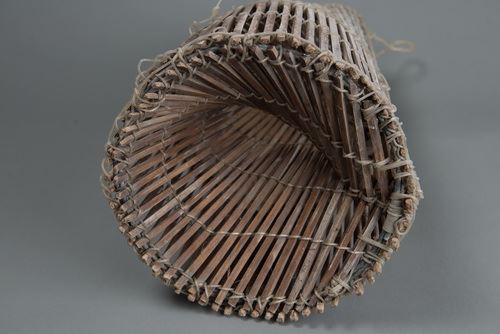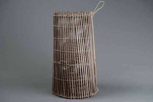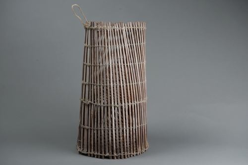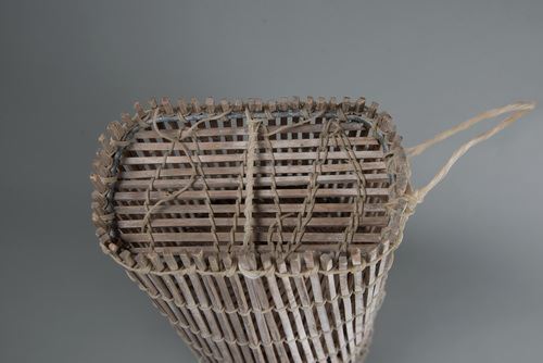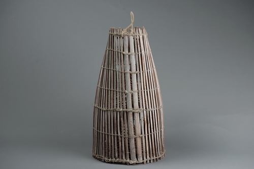 該件魚筌的形制為上方下圓,以較方形竹條製成,較為堅硬耐用,經得起沖撞。魚筌的制作過程會經過削竹、剖竹、編織、製作藤箍增加固定等步驟,完成的魚筌亦可透過煙燻來增添色澤等。