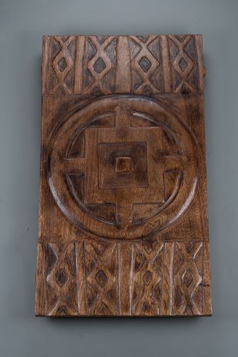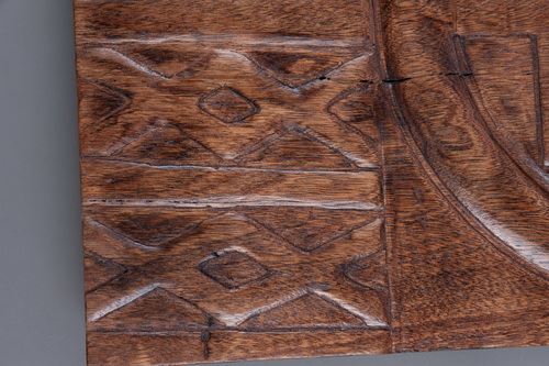 該木雕為噶瑪蘭族人參考臺大人類學博物館收藏的傳統噶瑪蘭人木刻雕板的圖紋,於近代重新創作的作品。噶瑪蘭族人的木雕特色為陰雕,是把紋路或圖像直接刻進木頭裡,再於陰刻的紋路上為木頭塗上顏料上色。