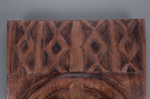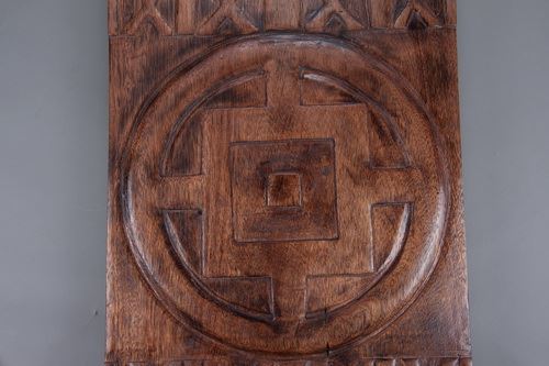 該件木雕的版面配置以布滿為主,不同的幾何圖形組合在一起成為雕板的主體,雕板的邊緣裝飾,其排列整齊講求對稱,以菱形和三角形為主,發展出多重的三角形及菱形,中心則由圓形、方格紋、菱形紋等幾何形為特色。