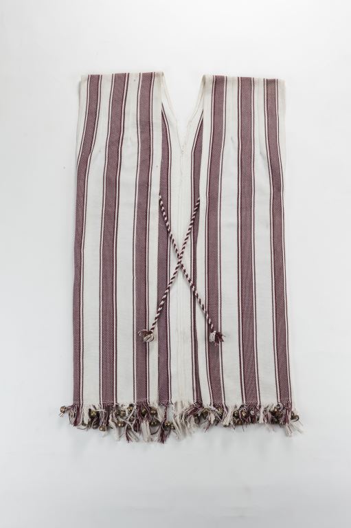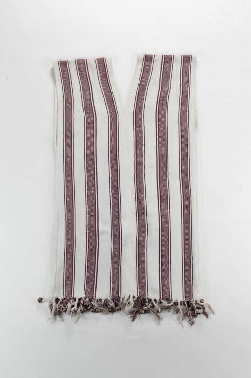 該件無袖方衣在形制上接近早期太魯閣族人於日常生活中所穿著的白底褐色條紋的麻布衣。