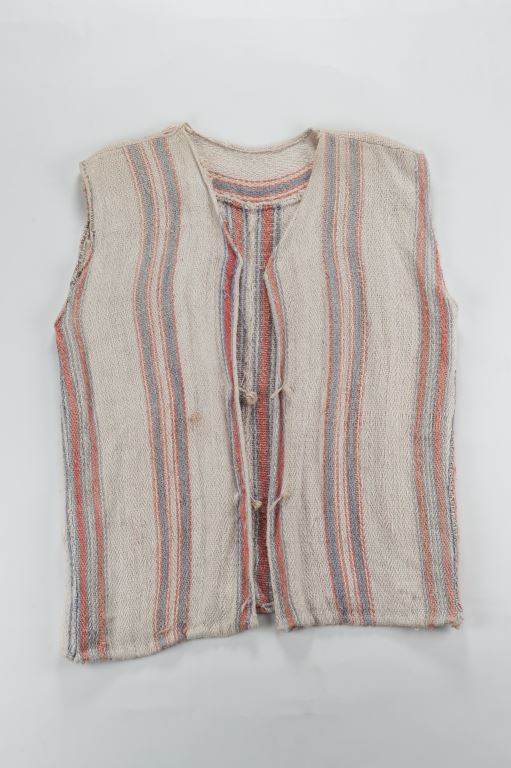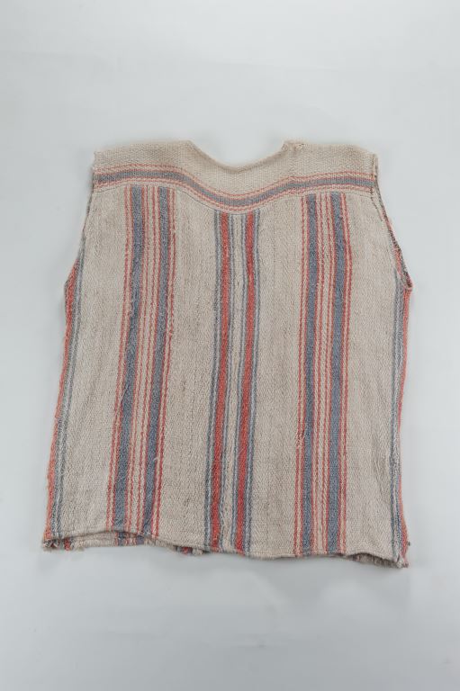 該件為以苧麻所織成的無袖對襟方衣,製作年代不詳,原為紅葉部落陳林宗義所收藏,後由花蓮縣萬榮鄉原住民族文物館所收購典藏。