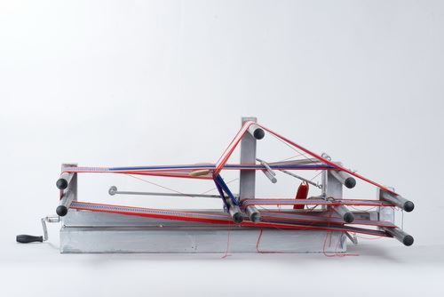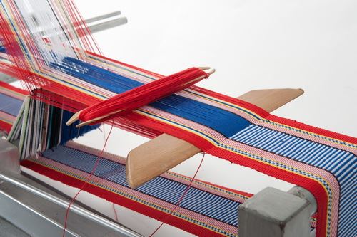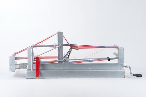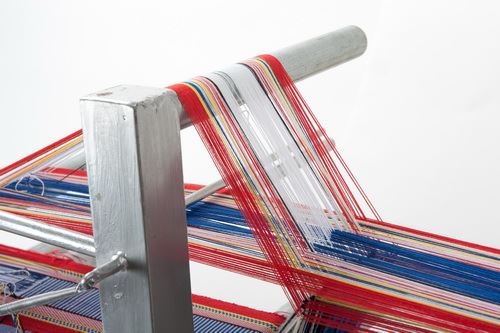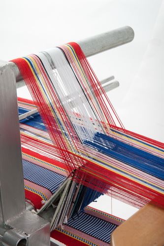 此為自紐西蘭引進的改良式桌上織帶機,屬於立式織布機,相對於傳統式的「水平式背帶腰織機」,容易因為長期久坐對腰部形成壓迫,此款織布機採用坐或站的方式來進行織布,使用者可以直接在織布機上整經上線,製作織品所需花費的時間也較短,因此也成為近代原住民族人重拾織布工藝的新式織具。