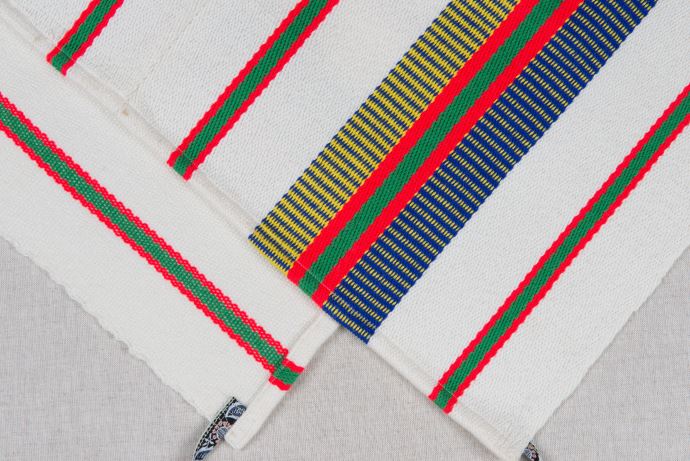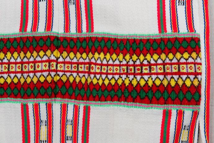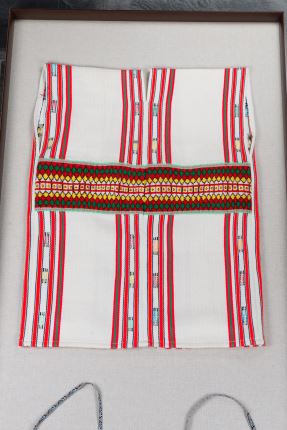 該件男子服飾共有:無袖對襟長上衣及胸布,長上衣的花紋呈直條形紋。