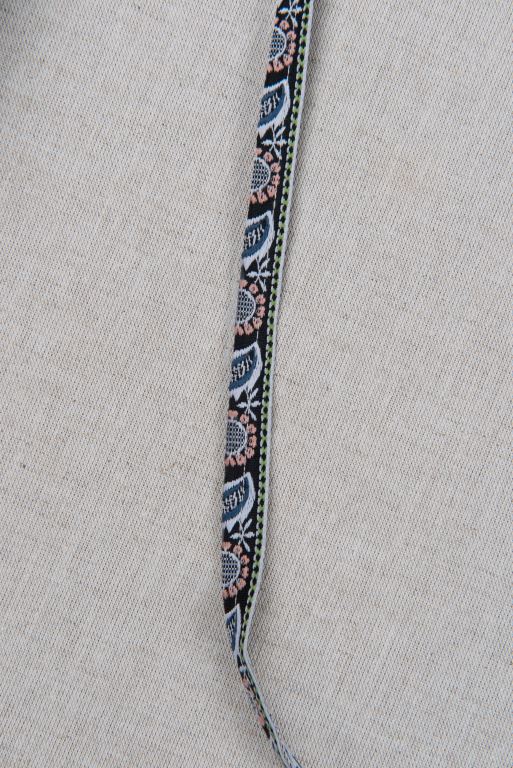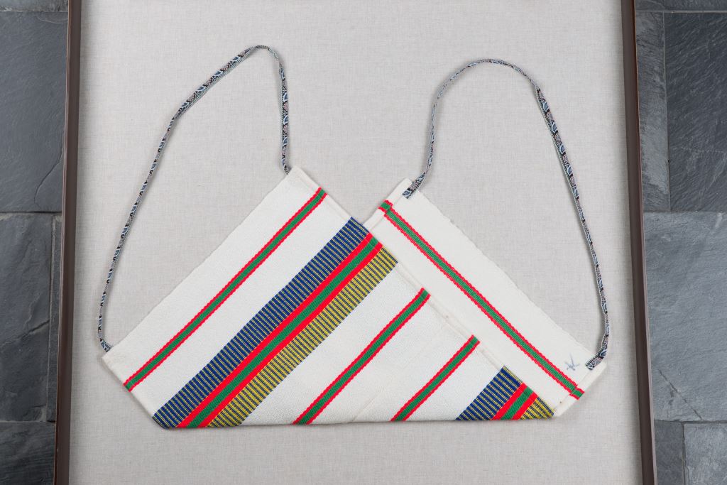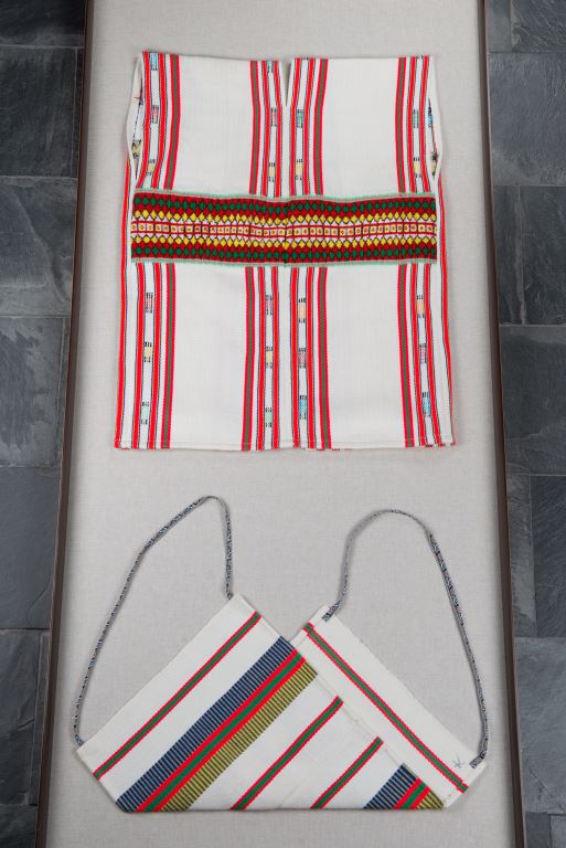 該件男子服飾共有:無袖對襟長上衣及胸布,長上衣的花紋呈直條形紋。