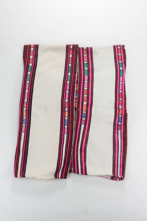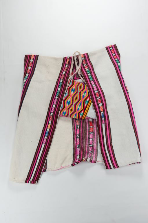 該件布農族男子服飾有無袖對襟長上衣及胸布,上衣以白色為主色,前襟有條狀花紋,背部則挑織著菱紋、山形紋等的紋樣,其胸兜有挑織各色花紋,是盛裝時所穿戴的服飾,製作年代為西元1983年。