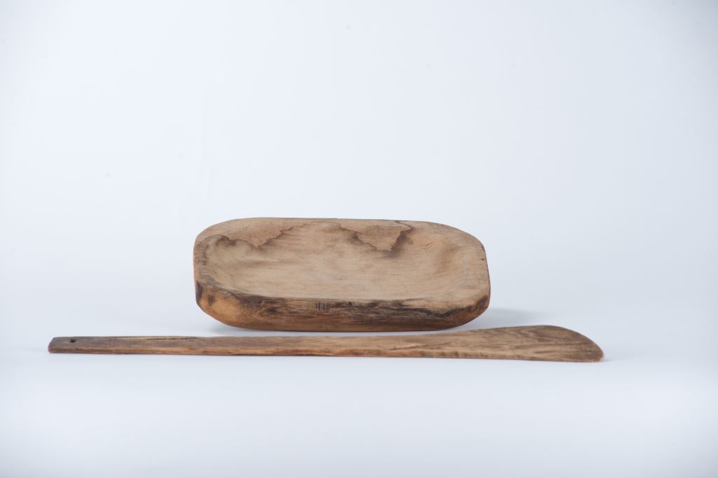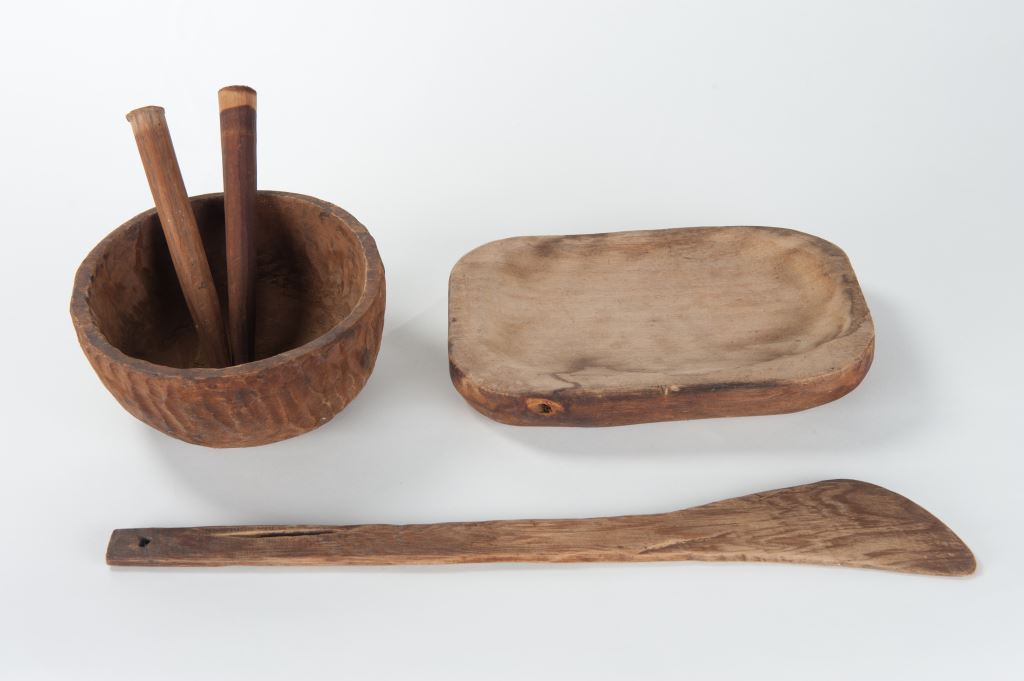 該組件有木盤、木碗、攪飯木匙等物件,製作年代約為1943年,是布農族人用木頭製成的飲食用具。布農族食物盤一般選用楠木、樟木等堅硬的木材,並經刨鑿、打磨處理,而無雕刻紋飾。