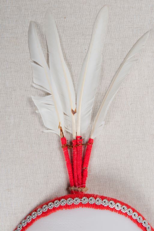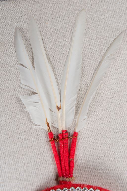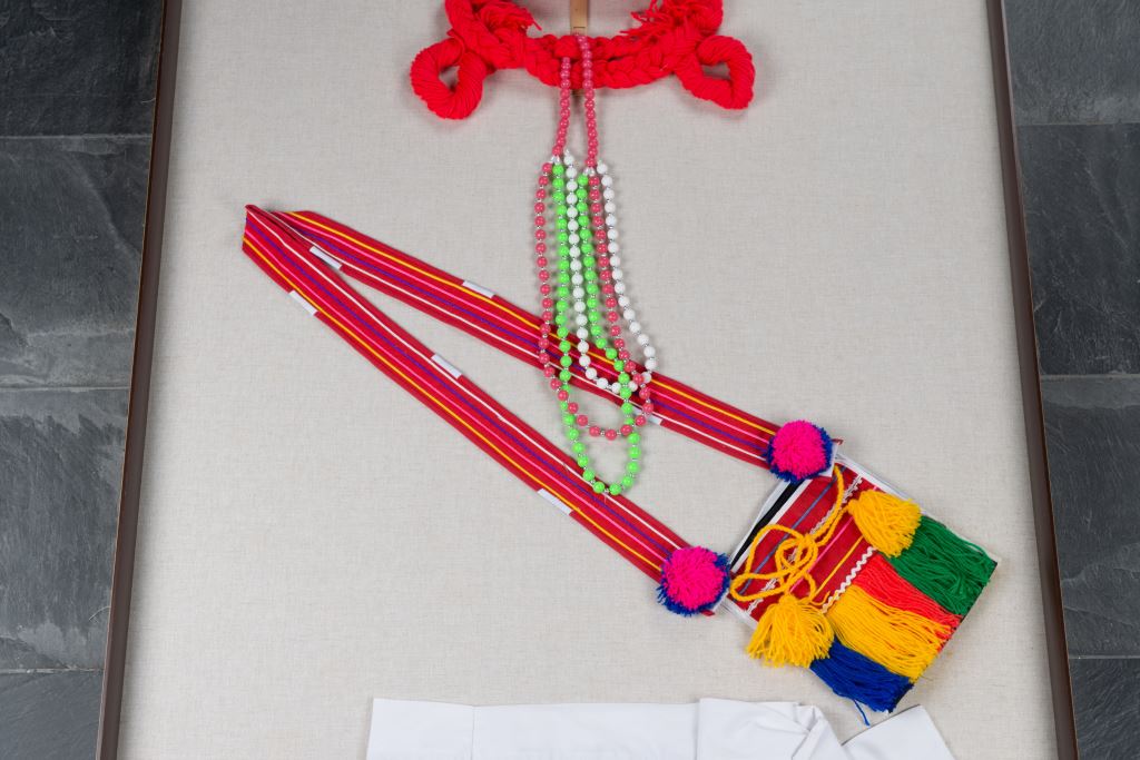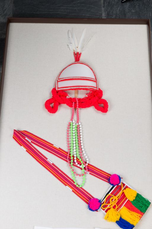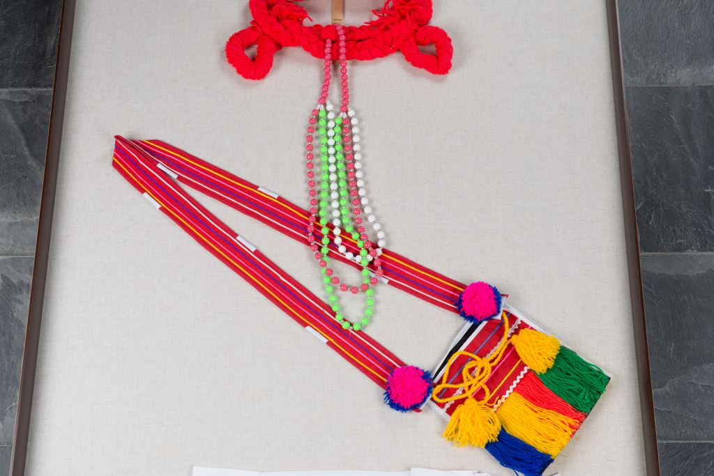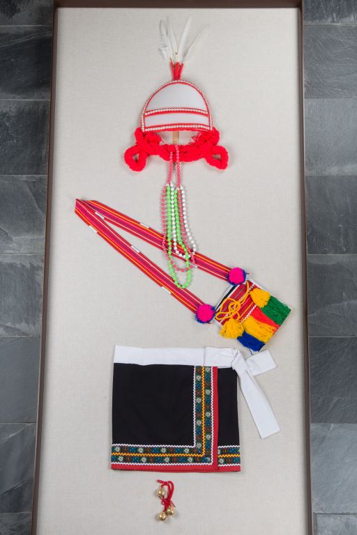 本套男子服飾包括頭飾、項鍊、攜物袋(檳榔袋)、腰帶、黑片裙、鈴鐺等,Tapalong(太巴塱)部落位於花蓮鄉光復鄉,在阿美族的地域群中屬於秀姑巒阿美。
