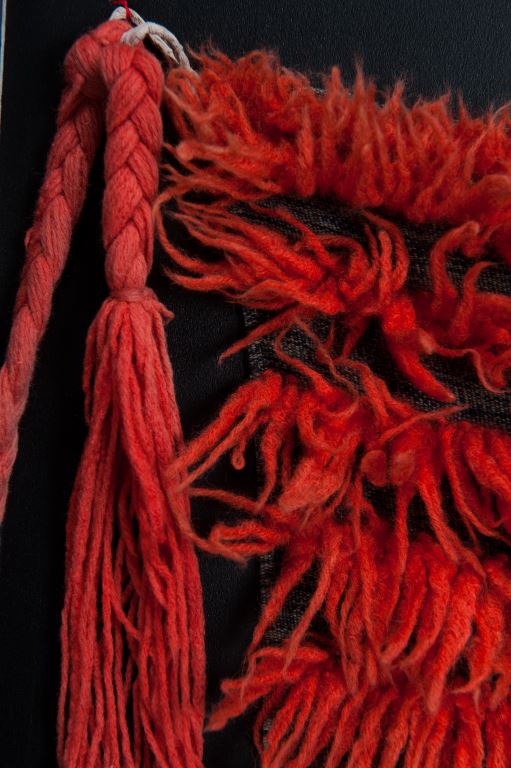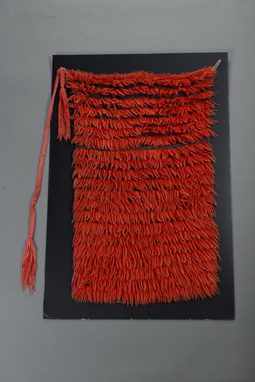 此件披肩以三塊長方形的手織黑布為底,上面挑織著紅色的毛線,於寬邊相縫合而成一披肩。上緣兩端一邊縫有麻線編成的環,可與另一邊的綁帶相繫之。披肩上方紅色毛線是挑織於黑布的緯線上,紋樣為橫條紋。