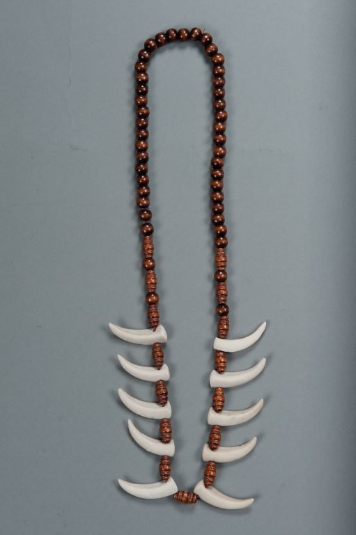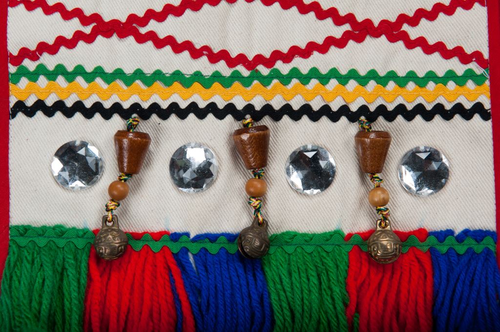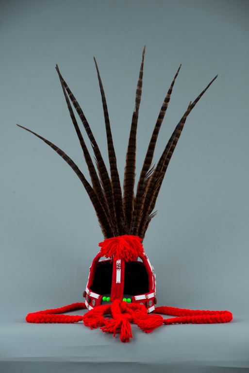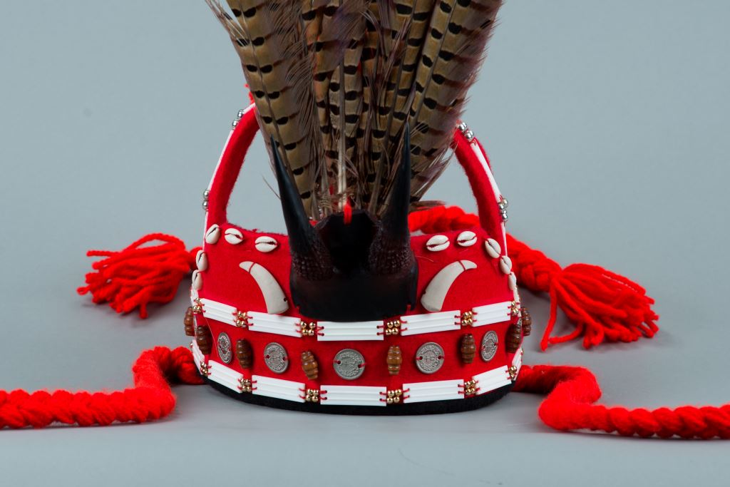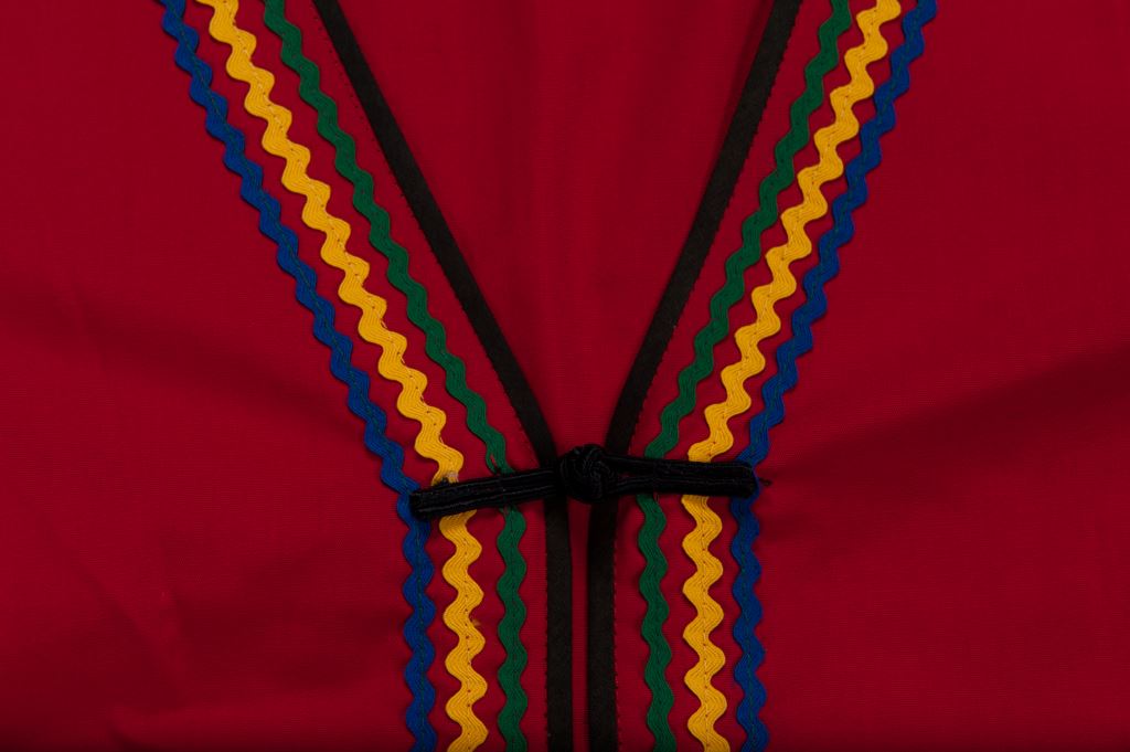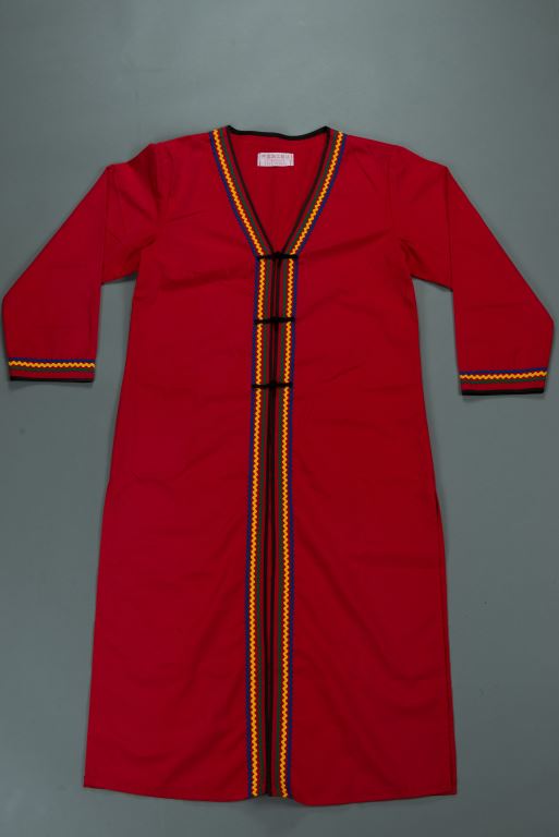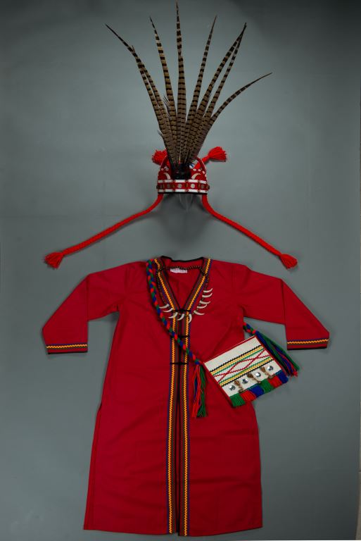此為花蓮縣壽豐鄉公所為其鄉內部落頭目統一製作的頭目服飾,形制為紅色長袍、頭目羽冠,搭配項鍊、攜物袋等飾物,雖已大量使用人造纖維、塑膠串珠等材質,但仍在頭目羽帽的上以山豬牙、山羌角、羽毛等