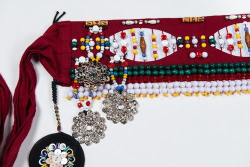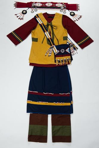 撒奇萊雅族服以土金色與暗紅色為主色,土金色代表土地,暗紅色代表祖先於「加禮宛事件」中祖先凝乾的鮮血。婦女服飾的背心為土金色、內長袍為凝血色,代表成熟女子負有保有土地及延續血脈的重要責任。女子頭飾的白色串珠代表祖先逃難時的眼淚,綠串珠代表年齡階級晉階時所種植的部落圍牆-刺竹。裙圍及腳套上的咖啡色、綠色碎片代表祖先逃難時沾在衣服上的樹枝、草及泥巴,寓意勿忘祖先的苦難。
